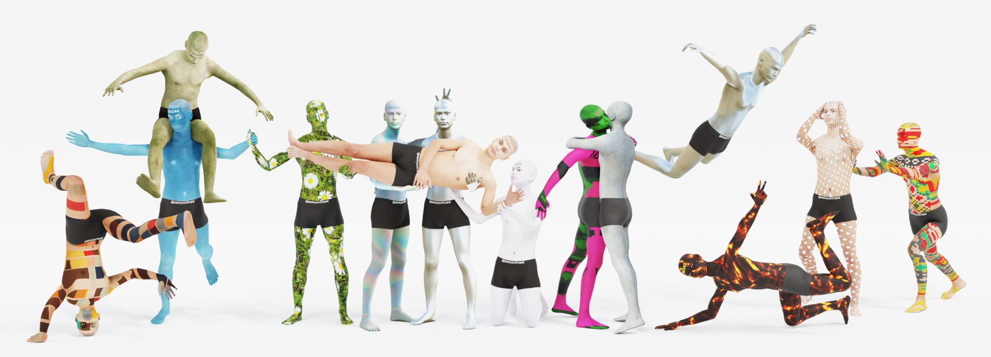 A similar shift can be traced in the practice of Manny Palou, aka Manny404, of the collective Art404. In 2018, Palou released a 3D scan of his body as a freely usable gaming avatar, distributed under permissive terms that he called “Do Whatever You Want But Don’t Be A Fucking Jerk Public License,” allowing anyone to use and profit from his image so long as the use is not hateful. The work’s protocol emphasized open viral spread and the flexible negotiation of identity across platforms. In 2021, Palou reintroduced the avatar as an NFT with customizable tattoos, accessories, and poses, writing lottery mechanics into the NFT’s smart contract—the self-executing agreement stored on the blockchain—so each mint had a random chance of containing rare traits like holographic skin. In the framework of Manny’s Game, collectors collaborated to assemble “master sets” of the rarest versions to unlock a prize pot. If the Web 2.0 version foregrounded open distribution, the web3 iteration specified scarcity and collectability while still fostering community and open-ended play.