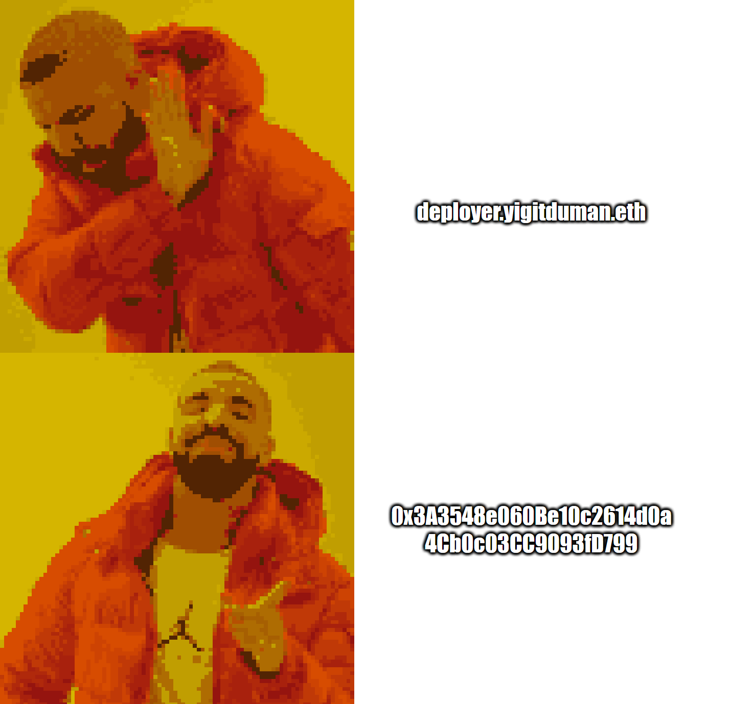 Contrast this with a later project like Yigit Duman’s Drakeflipping (2024), which operates on the blockchain and uses the familiar “Drakeposting” meme—juxtaposing screenshots from Drake’s “Hotline Bling” video where the singer emotes love and disgust—to visualize the transfer of a token from one digital wallet to another. Here the strings of letters and numbers that define ownership are always openly visible, and the image functions as an expressive translation of on-chain data rather than as a disguise for it. Both Kardashian Krypt and Drakeflipping are conceptual jokes that use celebrity images to underscore the internet’s status as a popular medium while pointing to specific operations that govern the use of its networks.